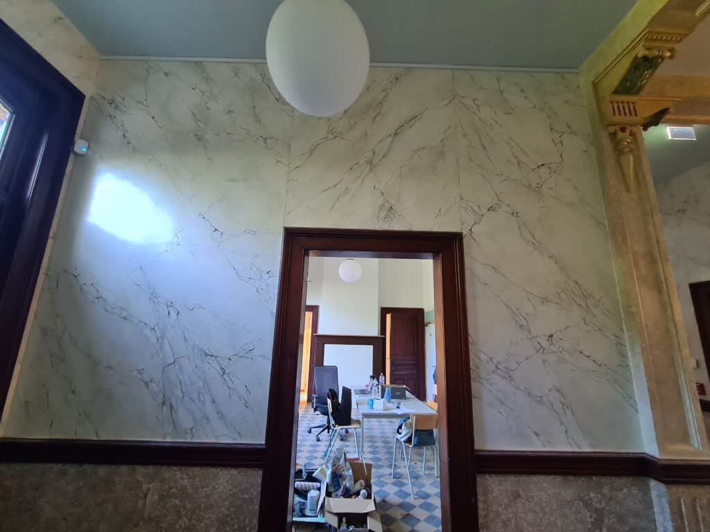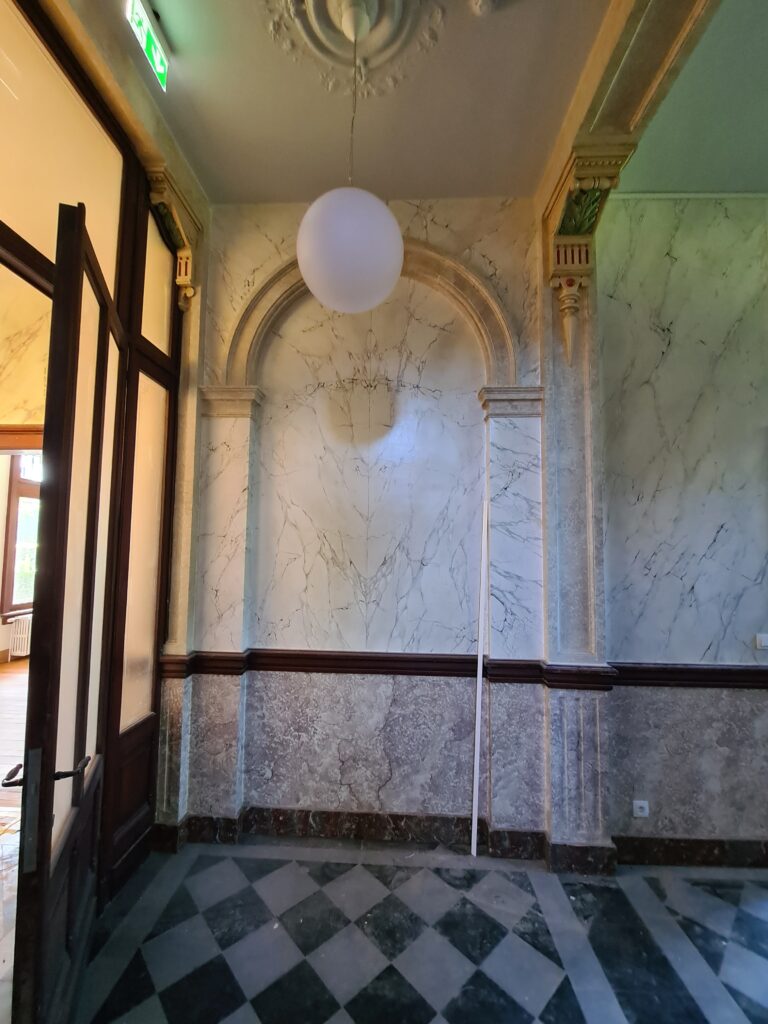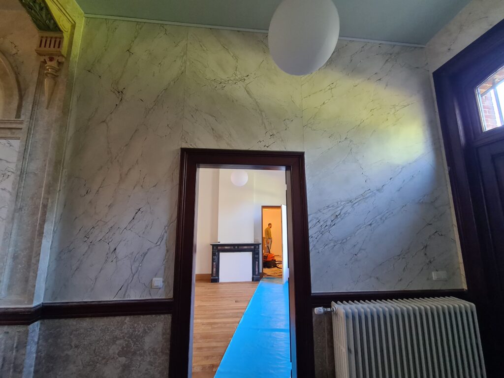 Het tweede gedeelte van de gang, tussen kamers 1 en 2, leidt achteraan naar de tuin. Op de muren rechts en links is een ophangrail voorzien met links en rechts van de deur een open ruimte van 1,6 en 1 meter. Op het einde van de traphal is een boog met binnen in een breedte van 1,3 meter waar ook een werk kan opgehangen worden. Hoogte van het brede gedeelte tot de lambrisering is 2,35 meter.