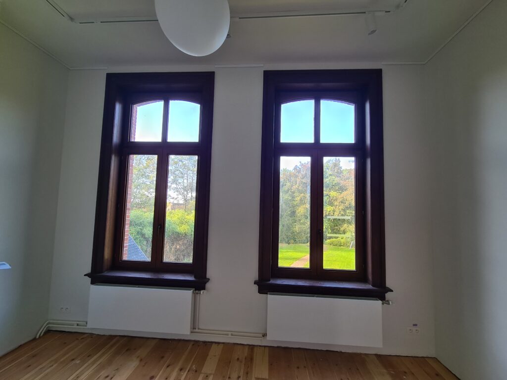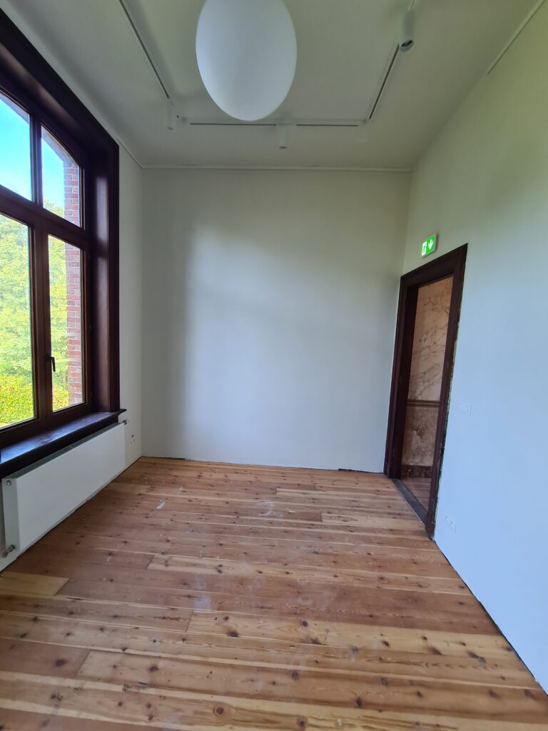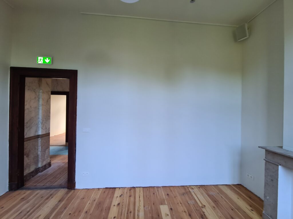 Kamer zeven kijkt uit op de tuin. Afmetingen: 4,9m op 3,2m. 11,6 lopende meter open muur met ophangrail. Aanpasbare verlichting. Ramen kunnen verduisterd worden.